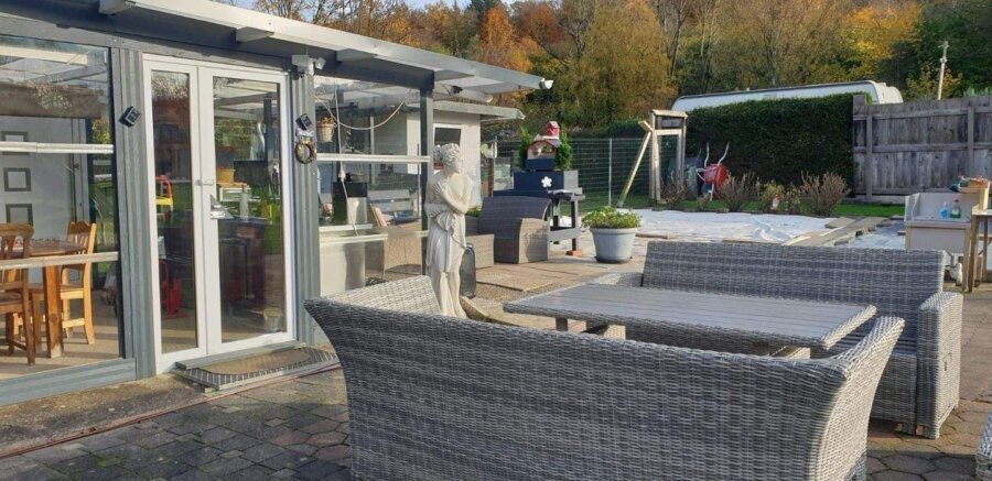Zum Anwesen gehören zudem ein gemauerter Hühnerstall mit angrenzender Hütte (zusammen ca. 45 m²) sowie ein weiterer Nebenraum von ca. 45 m², für den bereits Wasser- und Stromanschlüsse vorbereitet wurden. Dieser Bereich bietet ausgezeichnetes Potenzial für eine Erweiterung – beispielsweise als Atelier, Werkstatt, Gästehaus oder Hobbyfläche.