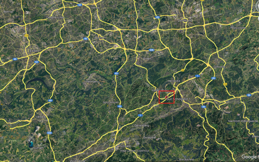 Das Anwesen Gut Schönfeld 1 befindet sich im westlichen Stadtgebiet von 58089 Hagen, eingebettet in eine ruhige, naturnahe Umgebung mit hohem Erholungswert. Die Lage vereint ländliche Atmosphäre mit einer sehr guten infrastrukturellen Anbindung an das Stadtzentrum und die umliegenden Metropolen des Ruhrgebiets.