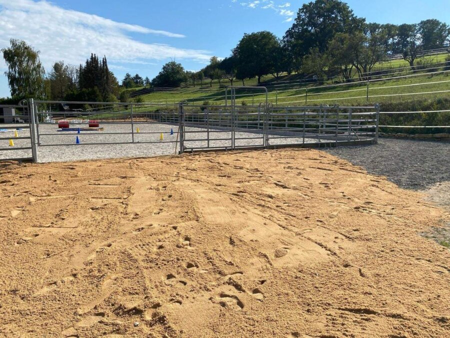 Die Reitanlage wurde 2012 errichtet und ursprünglich nur etwa zwei Jahre in Betrieb genommen. Sie umfasste 14 Boxen, teilweise mit Paddock, eine Sattelkammer, einen Reitplatz, angrenzende Koppeln, ein Reiterstüble sowie ein Heizsystem für die Tränken. Im Jahr 2020 erfolgten umfangreiche Umbauarbeiten zur Nutzung als Offenstall mit Paddocktrail. Die gesamte Anlage ist mit einer hochwertigen, langlebigen Einzäunung ausgestattet und eignet sich auch für Hengsthaltung. Zudem wurde ein hochwertiger Reitplatz neu errichtet. Aktuell sind 4 Paddockboxen und 2 Innenboxen erhalten geblieben. Ein Rückbau zu einem reinen Boxenstall ist jederzeit problemlos möglich; bei vollständigem Rückbau stehen derzeit 14 Boxen zur Verfügung, darüber hinaus besteht weiteres Erweiterungspotenzial.