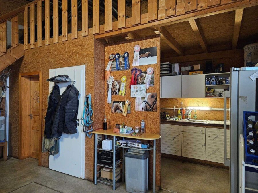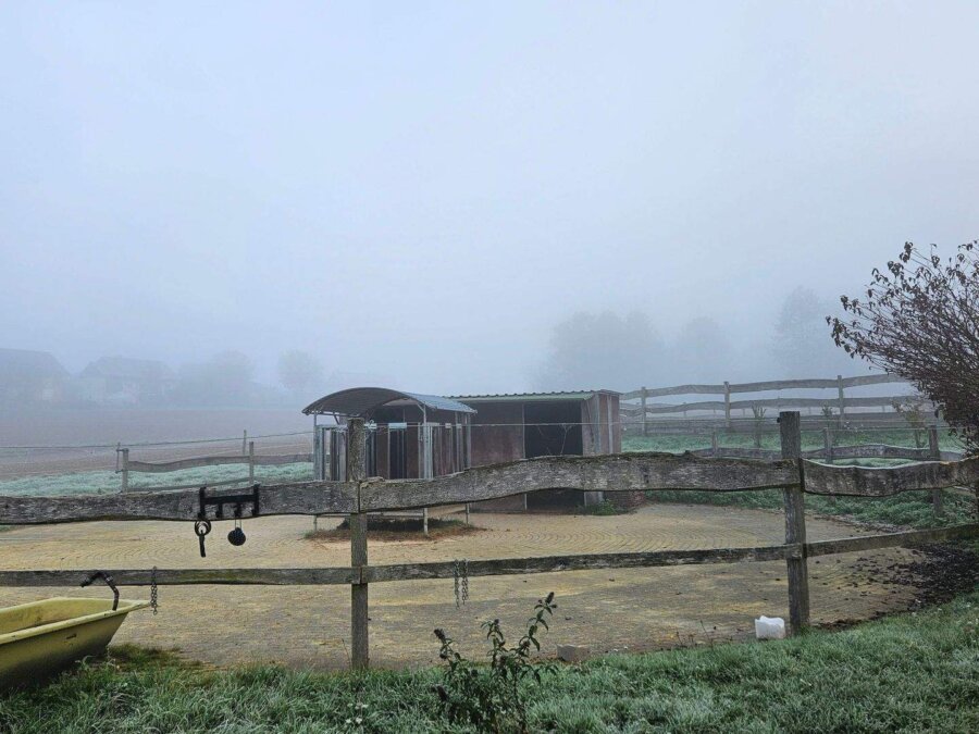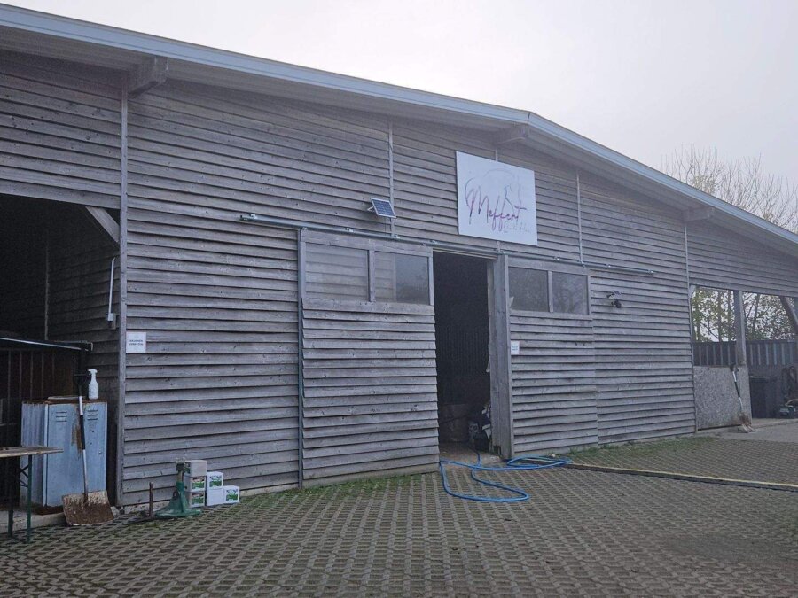Die Reitanlage selbst liegt in völliger Alleinlage außerhalb des Ortes, umgeben von weitläufigen Wiesen und Feldern. Diese abgeschiedene Position bietet nicht nur eine unvergleichliche Ruhe und Privatsphäre, sondern auch ideale Bedingungen für die artgerechte Tierhaltung. Die Pferde genießen eine naturnahe Umgebung ohne störenden Verkehr oder Lärm, und die Landschaft lädt zu ausgedehnten Ausritten und Spaziergängen ein.